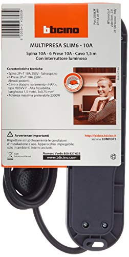 BTicino 3630GB Ciabatta Multipresa Slim6 Appendibile con Interruttore Laterale Luminoso, 6 Prese, 10A, 2200 W, 250 V, Nero