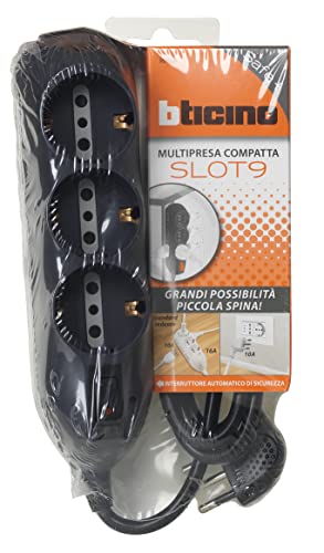 BTICINO Ciabatta Multipresa Elettrica Slot 9 Posti, 3 Polivalenti Schuko 10/16A + 6 Bivalenti 10/16A, Ciabatta Elettrica con Interruttore e Cavo 1,5m Spina 10A, Robusta Salvaspazio Flessibile, Nero