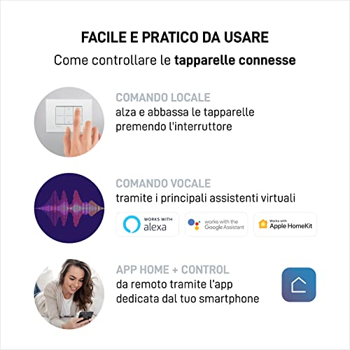 DIVERSE MODALITÁ DI CONTROLLO: Controlla le tapparelle in modo tradizionale, premendo l'interruttore, con il comando generale entra ed esci, da smartphone tramite l'app Home + Control o con gli assistenti vocali Google Home, Alexa e Siri