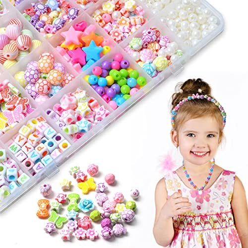 ❥ .Kit di perline e gioielli per bambini 600 pezzi da 5 mm a 12 mm di perline colorate in 24 diverse forme e colori tra cui fiori, farfalle, lettere, alfabeto, perline, foglie, pesce, forma di cuore, sorriso, frutta, stella e altro ancora.
