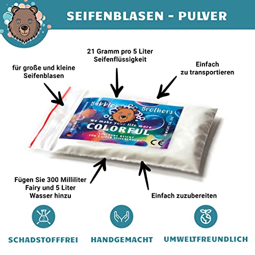 Polvere magica di Bubble Brothers. Le migliori bolle si ottengono solo con la polvere magica di Bubble Brothers. Questo garantisce bolle di sapone belle, colorate, durevoli e grandi.