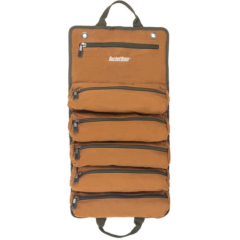 Il Super Tool Roll è dotato di 6 tasche orizzontali con cerniera, che lo rendono ideale per trasportare saldamente elementi di fissaggio e parti sfusi. Realizzato in tela Duckwear resistente, che è preferito rispetto al poliestere perché la tela assorbirà l'olio per utensili nel tempo come un guanto da baseball ben oliato. I rotoli di utensili in poliestere tendono a trasformarsi in fettine di olio. Il Super Tool Roll è fissato da due fibbie a sgancio rapido quando arrotolato, e include una maniglia per il trasporto.
