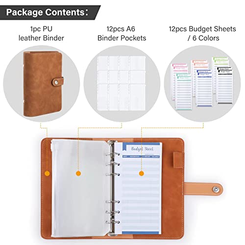 A6 Budget Binder, Badve 6 Anelli PU Cash Stuffing Quaderni ad Anelli con 12 Binder Tasche/ 12 Fogli per Budget/ 2 Etichette Autoadesive per Money Binder, Budget Planner - Marrone
