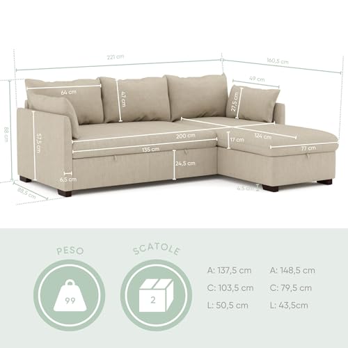 Dimensioni del divano: 220 cm di larghezza x 86 cm di profondità e 160 cm di profondità della chaise longue x 90 cm di altezza. Dimensioni del letto: 220 cm di larghezza x 160 cm di profondità.