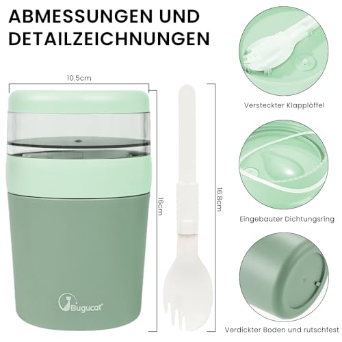 Bugucat Tazza Yogurt to Go, Tazze Cereali 500ML+150ML, Portatile Cucchiaio Tazza Contenitore Yogurt con Cucchiaio, Tazze Cereali, Versatile Yogurt Frutta Contenitore, Tazza di Muesli To Go, Verde