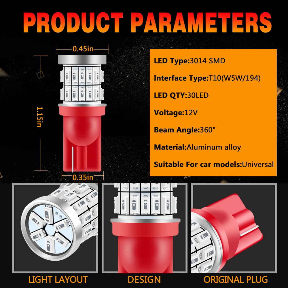 T10 194 W5W 168 LED Bulbs Super Bright 30smd Interior Dome Backup Reverse Map License Plate Light(White/Blue/Yellow/Red)