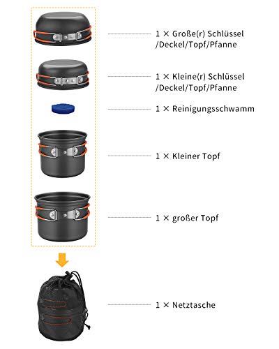 Ideale per 2 persone: il set da cucina da campeggio include 2 pentole con coperchio, 2 ciotole, 1 spugna per pulizia e 1 borsa per il trasporto. È possibile soddisfare completamente le esigenze di cottura di 2 persone.