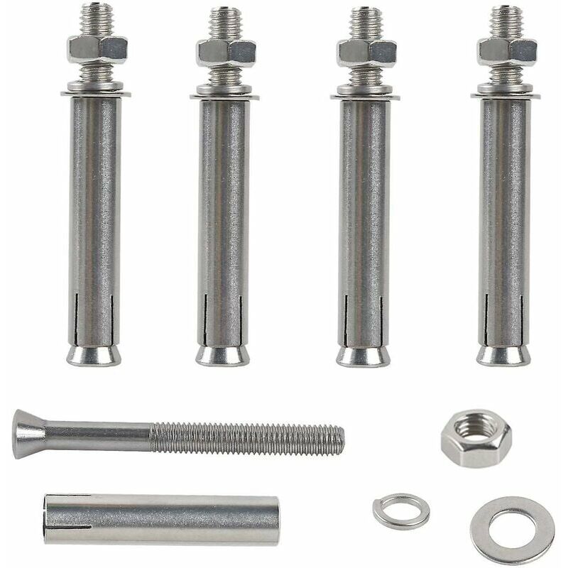 Dimensioni: 4 bulloni di espansione M8x100mm, lunghezza totale: 100 mm, diametro del tubo di espansione: 67,5 mm.Diametro filettatura:8 mm. Peso: 195 g Il bullone ha una capacità di carico molto elevata e può sopportare un peso di 100 kg Materiale: i bulloni di espansione sono realizzati in acciaio inossidabile 304, l'acciaio inossidabile 304 ha un'eccellente resistenza alla ruggine, alla corrosione e una buona corrosione dei cristalli resistenza. Superficie lucida resistente all'usura, durata a lungo termine, antiruggine, anticorrosione, antirottura. Funziona bene in ambienti interni ed esterni umidi Istruzioni per l'installazione: il tubo di espansione viene realizzato serrando un bullone. Il bullone disegna una rastremazione rastremata per estendere il manicotto contro la parete del foro. 1. Praticare un foro nel muro. 2. Pulire la sabbia e lo sporco nel foro. 3. Inserire la vite di espansione nel foro. 4. Utilizzare una chiave inglese per serrare il dado del bullone di espansione