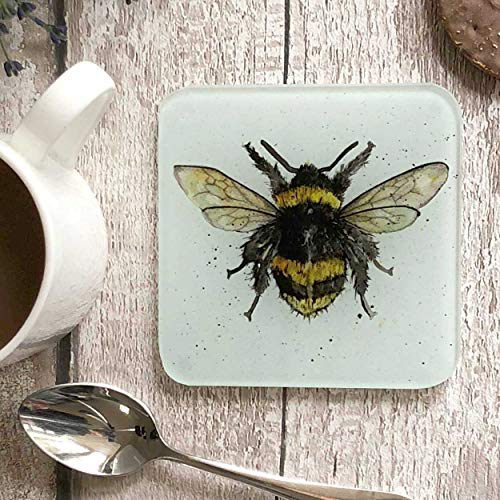 Bumble Bee Glass Coaster - Premium Drinks Mat, Artist Illustrated, 10cm x 10cm, Recycled Glass, Watercolour Bee Illustration, Single Coaster, by British Artist Sarah Boddy