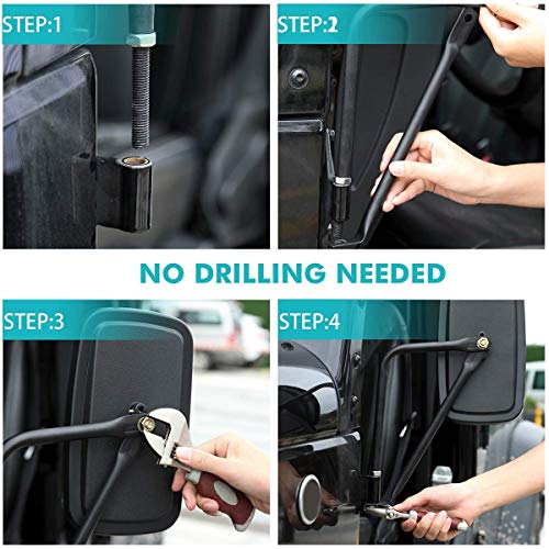 Installazione semplice perforazione. tutti i bulloni di cui bisogno, le dimensioni braccio dello specchio si adattano perfettamente al telaio parabrezza, non è necessaria alcuna perforazione durante l'installazione e incluse istruzioni chiare per facilitare l'installazione.