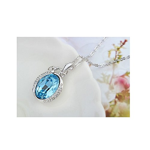 Amore nel cuore ... e al collo! Collana da donna in argento con ciondolo ovale sfarzoso. Il ciondolo è incastonato in un cristallo azzurro cielo luminoso austriaco e porta le lettere L-V-E, i bordi sono color argento con strass trasparenti che formano la "O"mancante. Un accessorio imperdibile per tutti gli innamorati!