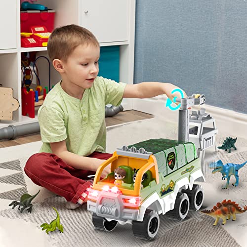 【Camion con suono e luce】 Batteria a bottone integrata, dotata di flash e 11 tipi di suoni simulati, basta premere l'interruttore per controllare le prestazioni di suono e luce. Con il ruggito dei dinosauri, le auto si avviano, i clacson e altro ancora, con musica realistica e luci scintillanti per migliorare l'esperienza di gioco dei bambini e portarli in un'avventura nella giungla giurassica.