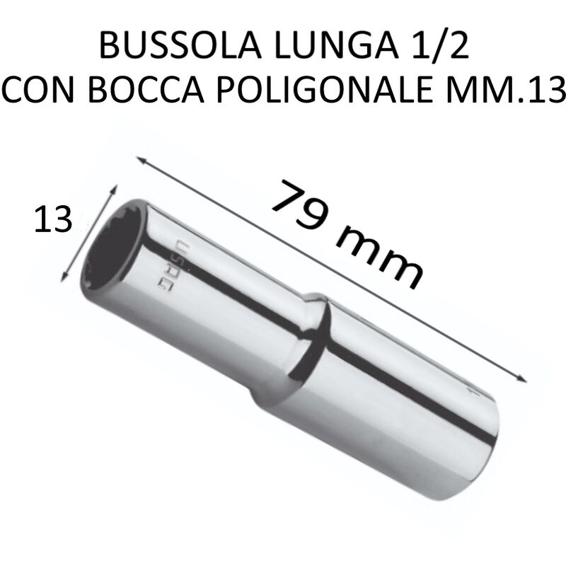 Chiave USAG a Bussola Lunga, con attacco da 1/2 e bocca Poligonale mm.13 Creata con Acciaio speciale altamente legato al Cromo Molibdeno DATI TECNICI: Attacco 1/2 Bocca mm.13 Lunghezza Bussola 79 mm