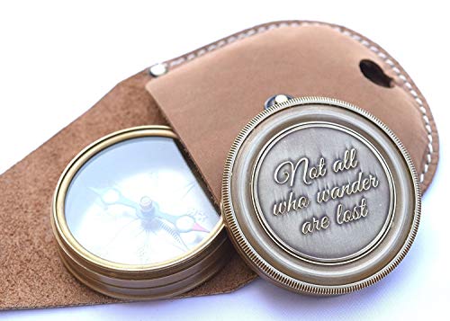 Bussola nautica Replica Hub Antique Compass Not All Who Wander Are Lost Incisione Ottone Bussola con Custodia in pelle, Compasso Pirati, Strumento di navigazione magnetico
