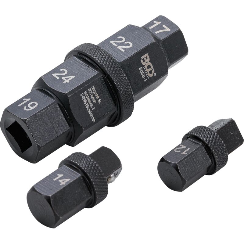 6 esagoni interni di diverse grandezze da 12 - 14 - 17 - 19 - 22 - 24 mm adatto per Yamaha, Kawasaki, BMW, Suzuki, Honda Oggetto della fornitura: 1 inserto speciale 17 - 19 - 22 - 24 mm, Lunghezza: 70 mm 1 adattatore con sfera di supporto 12 mm, Lunghezza: 30 mm 1 adattatore con sfera di supporto 14 mm, Lunghezza: 32 Profilo di azionamento Attacco esagonale Imballaggio adatto per essere appeso alla parete Ja Dimensione profilo di azionamento, metrico 10 mm Peso del tessuto 0.264 Dimensione del profilo di azionamento, imperiale 3/8 Dimensioni dell'imballaggio 1 Peso lordo 264 g Materiale (F) Chrom-Vanadium-Stahl