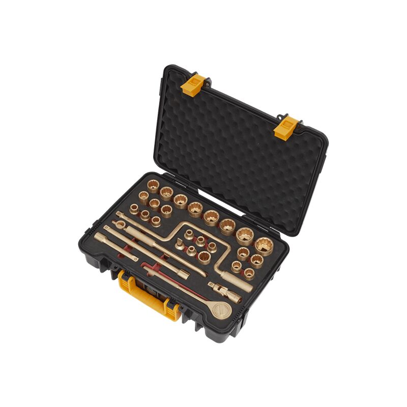 Set di bussole antiscintilla da 31 pezzi che fanno parte di una gamma completa di strumenti di sicurezza antiscintilla Premier, adatti per l'uso professionale quotidiano. In rame berillio forgiato. Include chiave a cricchetto da 1/2 ", inserto per candela, barre di estensione, barra a T scorrevole, chiave a manovella per bussole, supporto,impugnatura sfalsata e accessori per punte a bussola scanalate. Contenuto: bussole standard;