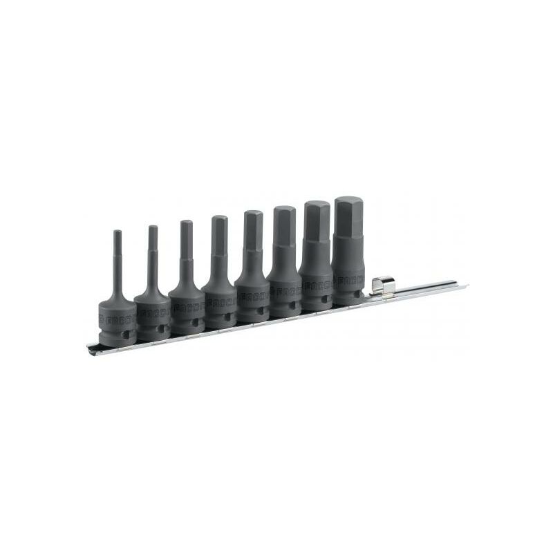 Dettagli: Per la vostra sicurezza, utilizzate le prese a urto con le boccole e i perni appropriati. Set di 8 bussole per cacciavite 1/2 per viti ad esagono cavo. Include le taglie: NSHM.5, 6, 8, 10, 12, 14, 17, 19. Fornito su una rastrelliera (CKS.95). Peso: 1,20 kg.