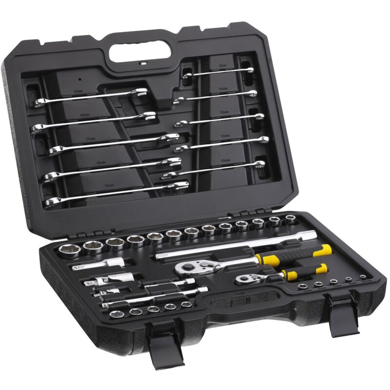 Il Set Chiavi Stanley è composto da un Kit da 41 pezzi in valigetta: 1 cricchetto att. 1/4 a 72 denti 10 chiavi a bussola esagonali finitura pulita att.1/4 (5,5-6-7-8-9-10-11-12- 13-14 mm) 2 prolunghe att.1/4 mm.75 e 125 1 snodo universale att.1/4 1 cricchetto att.1/2 a 72 denti 13 chiavi a bussola esagonali finitura pulita att.1/2 (10-11- 12-13-14-15-16-17-18-19-21-22-24 mm) 2 prolunghe att.1/2 mm 75 e 250 1 snodo universale att.1/2 10 chiavi combinate (8-10-11-12-13-14-16-17-18-19 mm) Valigetta in materiale sintetico con chiusure in metallo