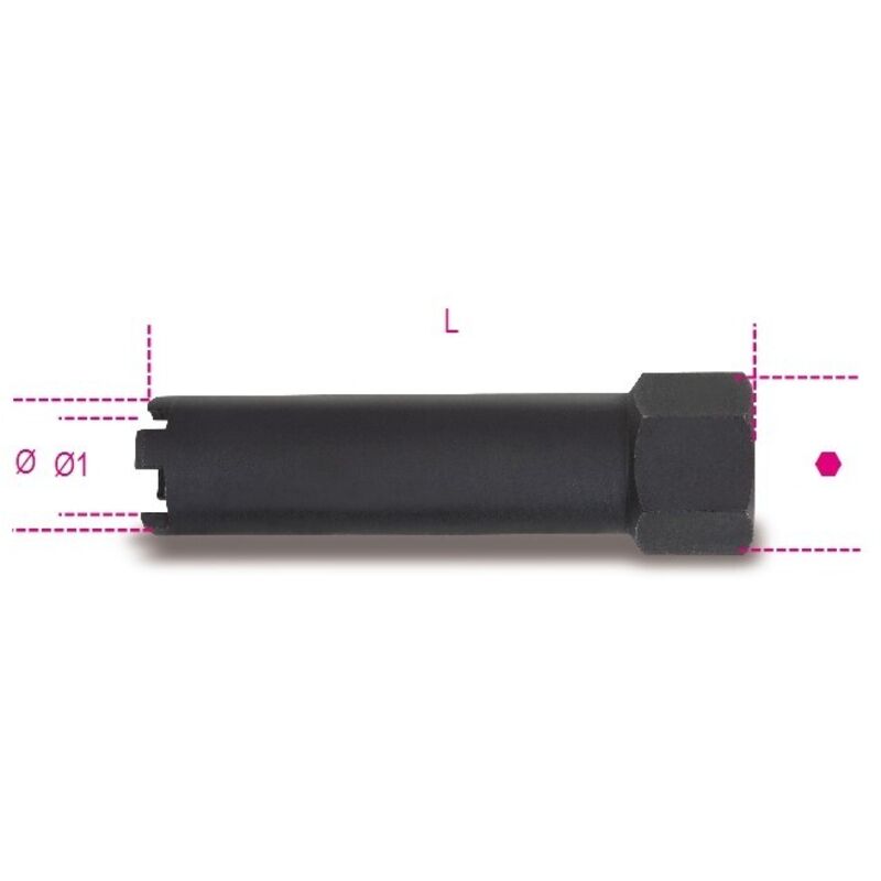 Chiave a bussola per ghiere portainiettori. Attacco: 32 Unità di misura: Millimetri Lunghezza: 122 mm Diametro: 28,5/22 mm Utilizzo: Ghiere portainiettori