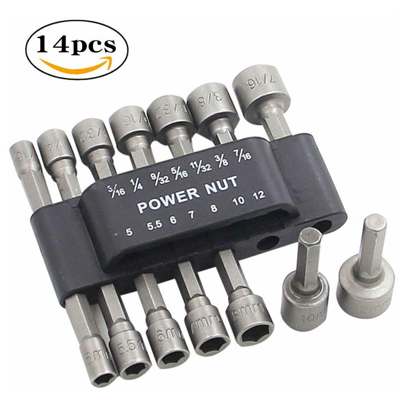 Diametro codolo esagonale - Questi cacciaviti con codolo esagonale da 1/4 "sono dotati di punte da trapano da 14 pezzi. Diametro asta: 6,35 mm. Lunghezza gambo: 2,2 cm. NOTE: Magnetic Free! [Elevata durezza e qualità] La punta del trapano per dadi è realizzata in acciaio al cromo vanadio di grado industriale, con elevata durezza dopo essere stata forgiata e temprata ad alta temperatura. La superficie è stata sabbiata contro la corrosione e la ruggine per una lunga durata. [Varie dimensioni] Il set di cacciaviti esagonali contiene varie dimensioni per soddisfare le tue esigenze. Punte per cacciavite Power Nut (SAE): 3/16, 1/4, 9/32, 5/16, 11/32, 3/8, 7/16 pollici;