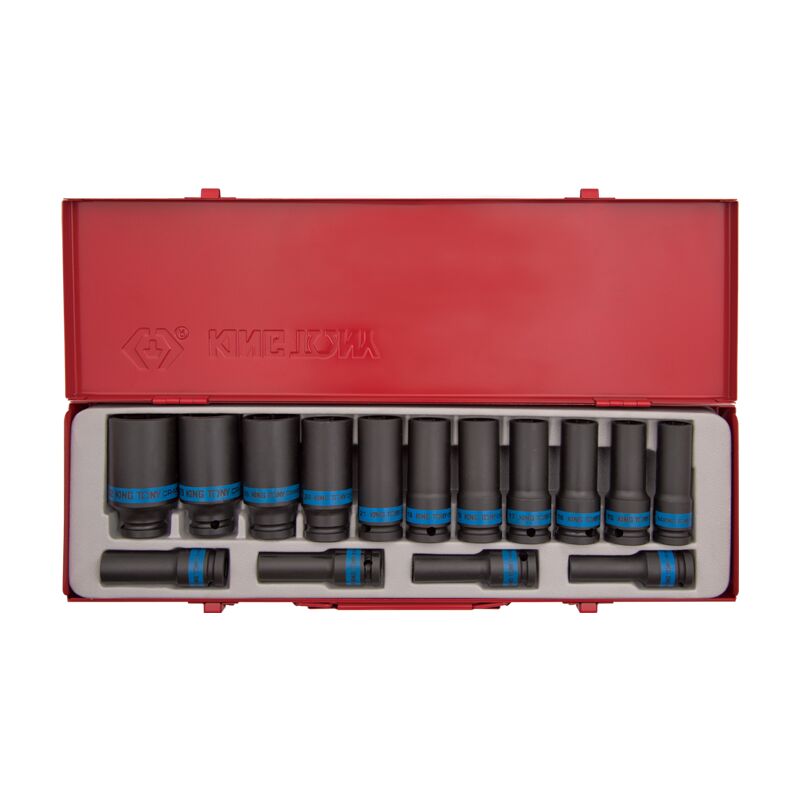 Un set di bussole a bussola King Tony lunghe da 1/2". Il set contiene 15 inserti per chiavi a bussola: 10, 11, 12, 13, 14, 15, 16, 17, 19, 21, 22, 24, 27, 30, 32. In custodia di metallo**