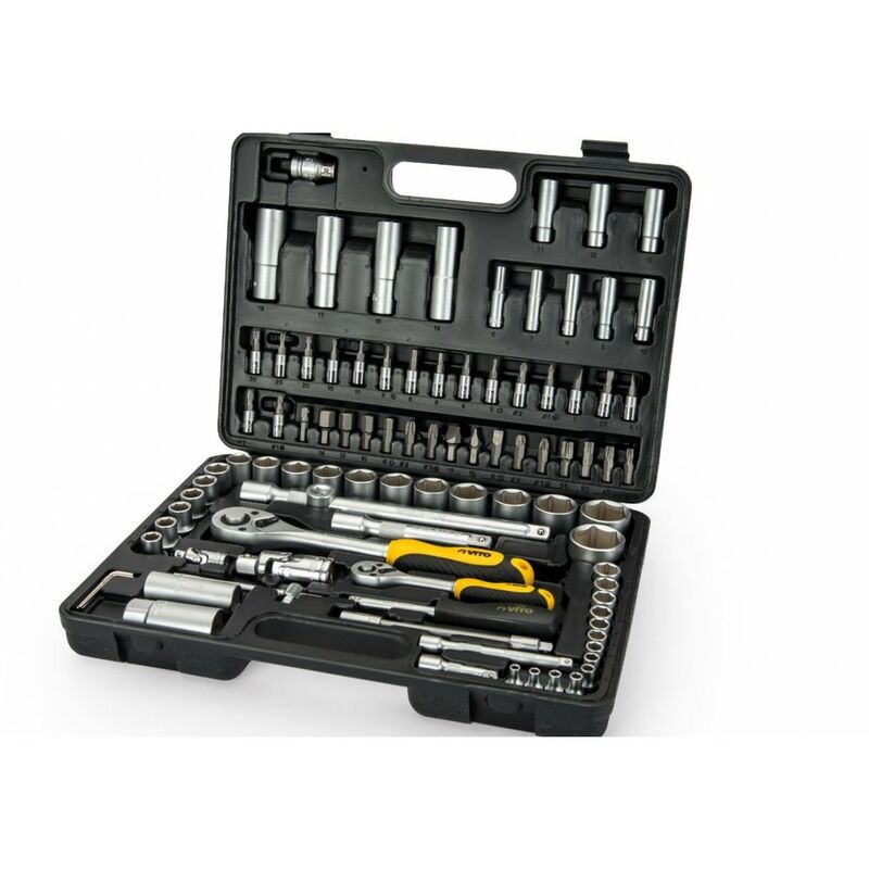 Avere sempre gli attrezzi a portata di mano con il set di bussole da 94 pezzi VIJR94 VITO . Questo è realizzato in plastica, è resistente alle cadute e agli urti. È progettato con fissaggi resistenti durante l'uso. Si apre facilmente con una sola mano. Gli utensili non possono arrugginire o deformarsi sotto pressione perché sono realizzati in cromo vanadio . Con dimensioni 37,5 x 27,5 x 8 cm (lunghezza x larghezza x spessore), pesa 6 kg. La cassetta degli attrezzi comprende: 33 prese: 18 prese da 1/2' (da 10 a 24, 27, 30, 32 mm) - 13 prese da 1/4' (4, 4,5, 5, 5.5, da 6 a 9, 10, da 11 a 14 mm) - 2 bussole/chiavi esagonali 33 punte: phillips, torx e lama piatta 12 cacciaviti (da 6 a 15, 17, 19 mm) 10 adattatori vari 3 chiavi: 2 chiavi a cricchetto - 1 chiave a barra deslipping 3 prolunghe: 2 prolunghe rigide - 1 prolunga flessibile Peso: 6 kg Dimensioni: 37,5 x 27,5 x 8 cm Materiale della valigetta: Plastica Materiale degli utensili: Cromo vanadio Numero di utensili: 94 pezzi