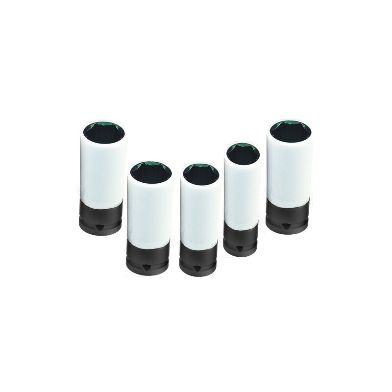 Serie di 5 bussole in acciaio temperato cromo molibdeno antigraffio. Espressamente ideate per cerchi in lega. Adatte per avvitatori ad impulsi, il rivestitmento in resina vinilica sia interno che esterno le rendono particolarmente adatte ad operare anche su bulloni di ruote leggere evitando di danneggiare o graffiare la superficie di lavoro. Caratteristiche Tecniche - Dimensioni (mm): 15 - 17 - 19 - 21 - 22 - Lunghezza (mm): 86 - Attacco: 1/2"