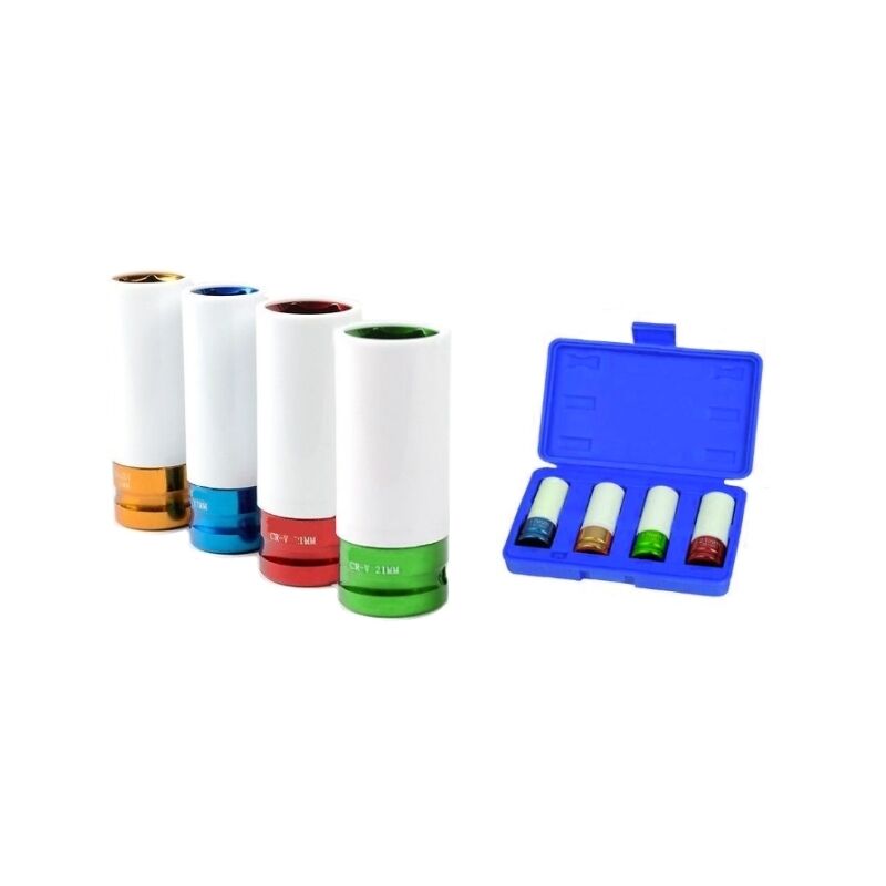Serie di 4 bussole in acciaio temperato cromo vanadio antigraffio. Espressamente ideate per cerchi in lega. Adatte per avvitatori ad impulsi, il rivestimento in resina vinilica le rende particolarmente adatte ad operare anche su bulloni di ruote leggere evitando di danneggiare o graffiare la superficie di lavoro. Offerte in comoda valigetta in plastica dura. Caratteristiche Tecniche - Lunghezza (mm): 80 - Misure (mm): 15/17/19/21
