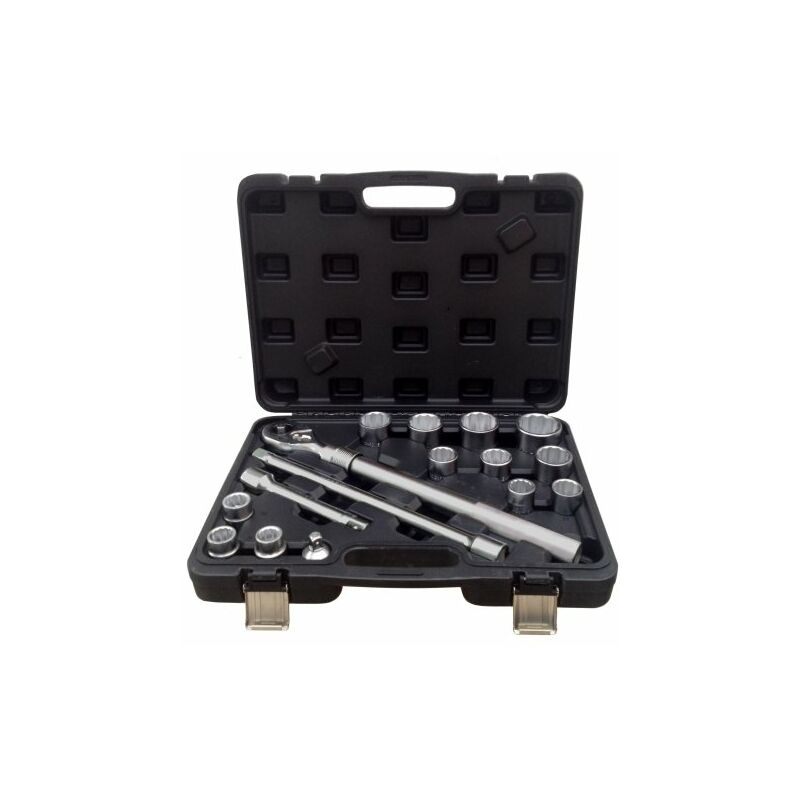 Set chiavi a bussola professionale. Grandi dimensioni per affrontare anche i lavori pi è impegnativi. La confezione comprende 12 bussole ad impronta esagonale con attacco 3/4" e con un assortimento di misure compresa da 19 a 50mm, un riduttore da 3/4" a 1