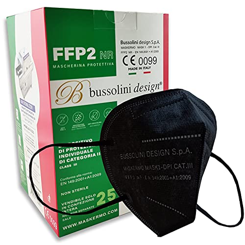 Bussolini Design Mascherine FFP2 Nere - certificate CE - Made in Italy - Sanificate con raggi UV - BFE ≥99% - 25 Mascherine Imbustate Singolarmente - Tendielastico in silicone incluso