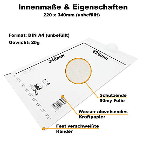 Dimensioni: Con dimensioni esterne di 24 x 35 cm e dimensioni interne di 22 x 34 cm, queste buste imbottite offrono spazio sufficiente per spedire oggetti fino al formato A4. Il tutto con un peso netto di soli 25 g.