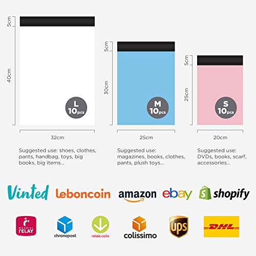 3 formati adatti per molteplici usi: 3 dimensioni di buste in plastica per spedizioni adatte a diversi usi: L 32 x 45 cm - 10 pezzi, ideale per scarpe da donna o bambino, maglioni, oggetti voluminosi, ecc. M 25 x 35 cm - 10 pezzi, ideale per vestiti, riviste, libri, documenti A4, regali, una scatola di medie dimensioni, ecc. S 20 x 30 cm. - 10 pezzi. Ideale per libri, DVD, CD, accessori, giocattoli, articoli per bambini e piccoli oggetti.