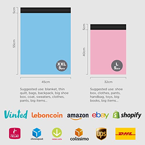 ✿【Grandi formati adatti multiuso】2 dimensioni di buste in plastica per spedizioni adatte a diversi usi: XXL 45 x 60 cm - 5 pezzi, ideale per grandi scatole per stivali o scarpe, borse, maglioni, cappotti, giocattoli, oggetti voluminosi, ecc. L 32 x 45 cm - 5 pezzi, ideale per scarpiere, maglioni, vestiti, pantaloni, regali, scatole di grandi dimensioni o medie ecc.