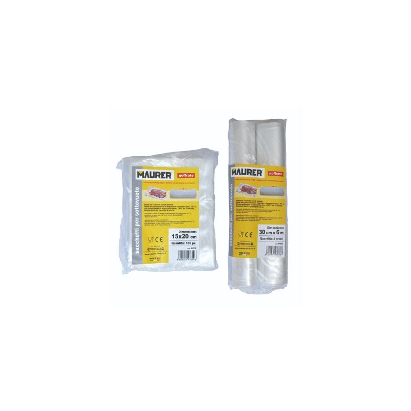 100 BUSTE SOTTOVUOTO PRETAGLIATE TIPO GOFFRATA Grazie a un processo speciale si crea da un lato una goffratura che permette una facile e rapida estrazione dell'aria la quale aumenta la durata di conservazione del prodotto contenuto Multistrato PA/PE - spessore 90 micron Dimensioni disponibili: - CM. 15 X 20 - CM. 15 X 25 - CM. 15 X 30 - CM. 15 X 40 - CM. 20 X 30 - CM. 25 X 35 - CM. 20 X 40 - CM. 30 X 40