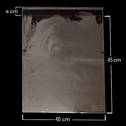 CONFEZIONE: 150 buste in cellophane 40x45 sigillate sui lati, con chiusura adesiva e senza cuciture o fori.
