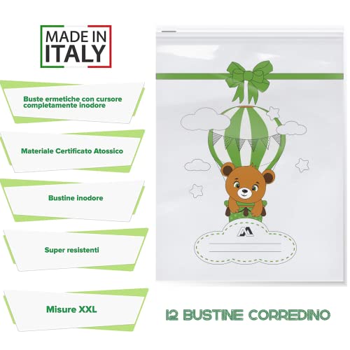 MISURE XXL PER CONTENERE IL PRIMO CORREDINO: 12 sacchetti cambio neonato 25x35 spessore rinforzato per contenere tutto il completino neonati: calzini, tutine, bavaglini, copertine, scarpine, mussole.