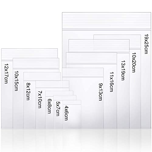 Dimensioni varie: Bustine trasparenti richiudibili includono varie dimensioni per la scelta: 4x6cm, 5x7cm, 6x8cm, 7x10cm, 8x12cm, 9x13cm, 10x15cm, 10x20cm, 11x16cm, 12x17cm, 13x19cm, 19x25cm. Bustine trasparenti richiudibili possono imballare oggetti di dimensioni diverse, oggetti di piccole dimensioni come: chicchi di caffè, perline fai da te, bottoni, hardware, varie piccole parti;