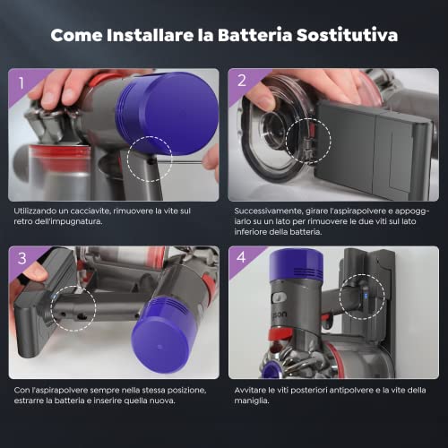 BuTure Batteria per dyson v8, Buture 4600mah maggiorata 21.6V Li-ION Batteria di ricambio compatibile con Dyson V8 SV10 Absolute Animal Fluffy Aspirapolvere ricambi Batteria e Dyson v8 avec 4 vis