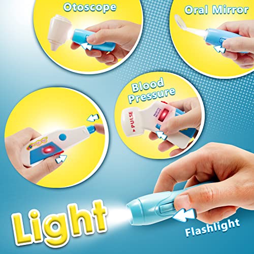【6 pezzi di Accessori Medico】- Include stetoscopio, otoscopio, specchio per la bocca, misuratore di pressione, torcia e altro ancora, tutti illuminati per attirare l'attenzione del bambino. (Batterie incluse)