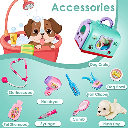 BUYGER 2 in 1 Valigetta Veterinario Dottore Bambini Giocattolo Parrucchiere con Peluche Cane, Giochi Bambina 3 4 5 Anni, Verde