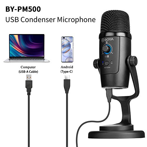 BOYA BY-PM500 - Microfono a condensatore USB con supporto da tavolo per streaming, podcast, YouTube Windows Mac PC e smartphone USB-C