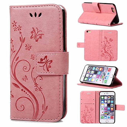 C-Super Mall-UK - Custodia per Apple iPhone 6 Plus / 6s Plus da 5,5” pollici, custodia a libro autoportante in pelle PU incisa con un cuore e una farfalla, custodia con chiusura magnetica.