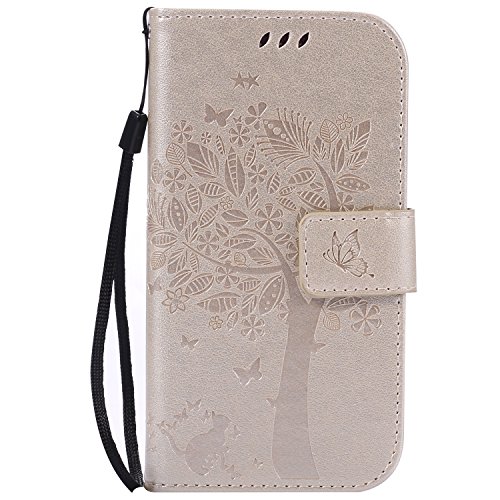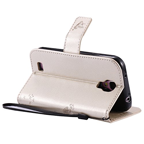 C-Super Mall-UK, custodia goffrata compatibile con Galaxy S4 i9500 e S4 Mini i9190, motivo con albero, gatto e farfalle, in ecopelle di poliuretano con patta anteriore, golden, Samsung Galaxy S4 i9500 / GT - i9505