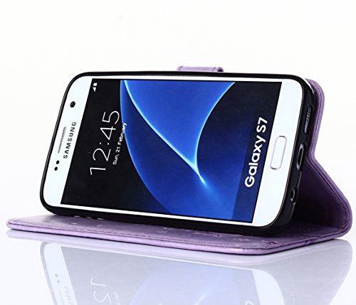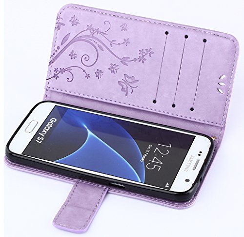 C-Super Mall-UK - Custodia per Samsung Galaxy S7, in pelle PU goffrata farfalla e fiore con supporto per Samsung Galaxy S7 (viola chiaro)