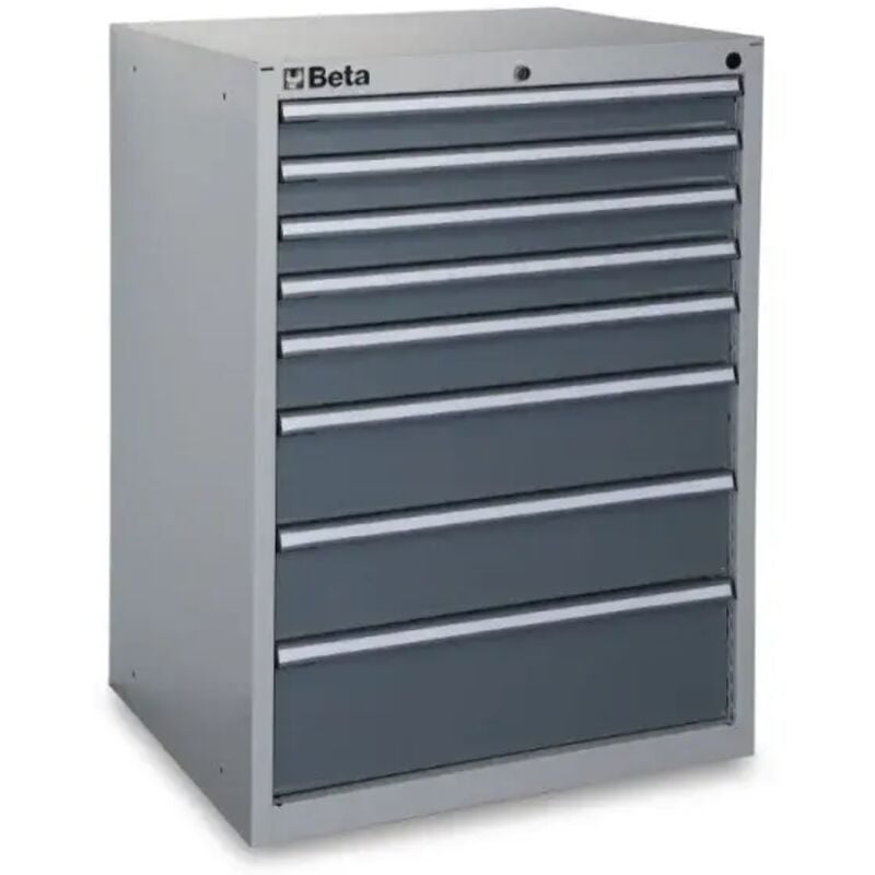 La cassettiera industriale fissa 8 cassetti Beta C35/8GM 035000182 è una soluzione solida e robusta, ideale per gli ambienti industriali.Resistente ed ampia, questa cassettiera fissa offre lo spazio necessario per riporre un ampio numero di utensili e strumenti di vario genere.Estremamente robusta, ogni singolo cassetto della linea industriale Beta offre una portata pari a 70 kg ed ogni cassettiera garantisce una capacità di carico statico totale pari a 1200 kg.I cassetti sono realizzati con possibilità di estrazione totale e presentano una superficie interna da 60x44,7 cm, garantendo tutto lo spazio necessario per riporre un vasto numero di utensili e materiali.Questo modello presenta ben quattro cassetti da 75 mm di altezza, due cassetti da 150 mm, un cassetto da 100 mm ed un cassetto da 200 mm, per offrire il massimo spazio e la massima versatilità.La cassettiera Beta C35/8GM presenta serratura centralizzata frontale di sicurezza e predisposizione per