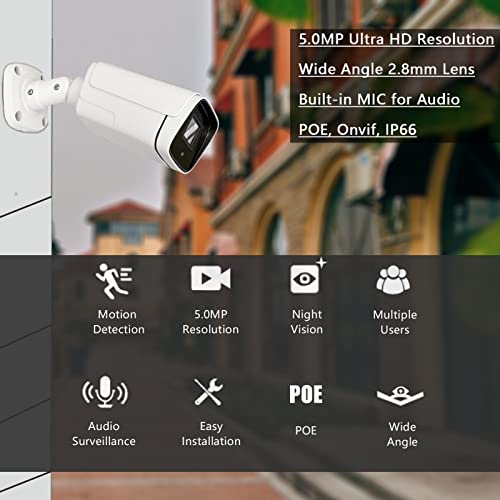 WiTi cablata Telecamera IP POE da 5MP, Telecamera Bullet di sorveglianza di sicurezza con microfono audio, Obiettivo grandangolare da 2.8mm Rilevazione del movimento,Metallo solido IP66