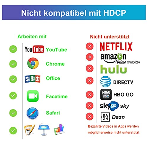 Siti Web e applicazioni applicabili: il cavo MHL Weton supporta il mirroring dello schermo di YouTube, FaceTime, Skype, WhatsApp, Office, Safari, Chrome ecc. Supporta un'uscita di segnale digitale ad alta risoluzione 1080p. Si prega di notare: il cavo da telefono a HDMI non è compatibile con Netflix/HBO GO/Xfinity Player/Amazon Prime/Hulu/Direcc TV e altre applicazioni video a pagamento.