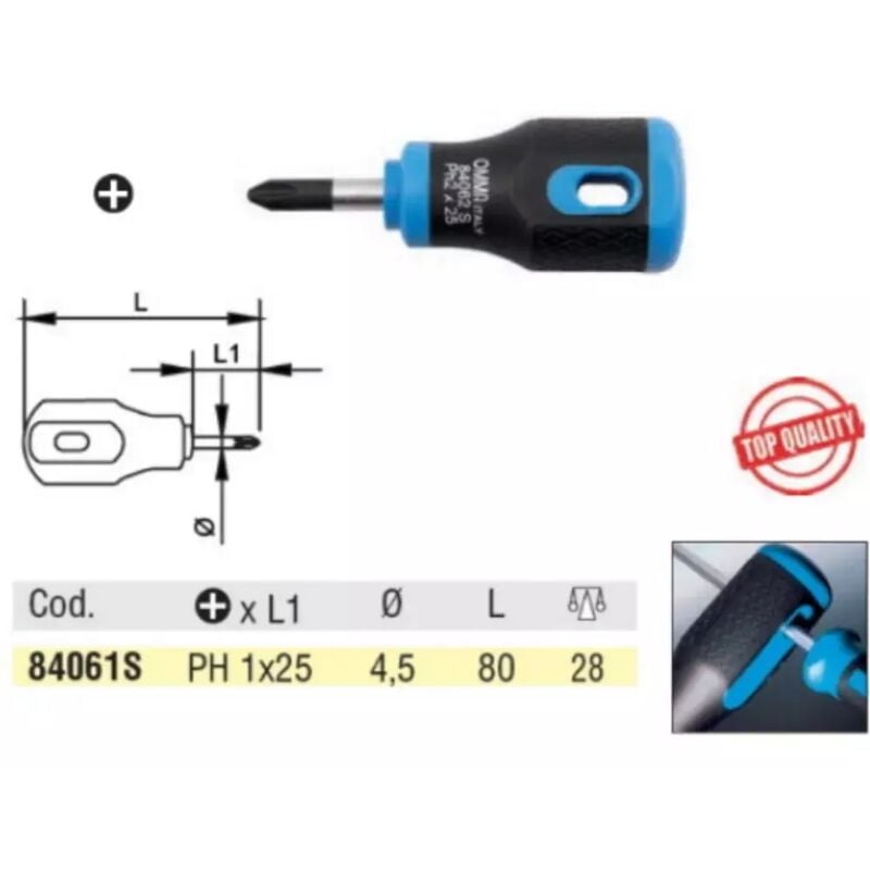 Giravite OMMA tipo corto per vite a croce Philips. In acciao al cromo vanadio - cromati punta nera manico in bi-componente. CROCE PHILIPS 1 GAMBO 25 mm.