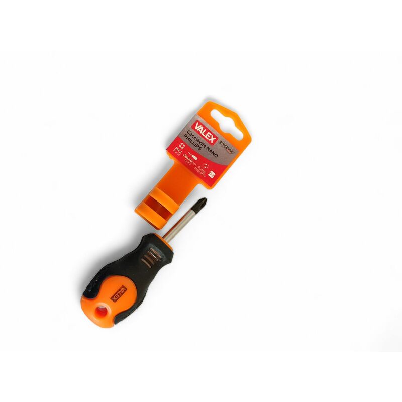 Cacciavite nano - Marca Valex - Phillips - Punta magnetica - Impugnatura morbida - Punta PH2 Cacciavite nano phillips Valex lama in acciaio cromo venadio, punta PH2 magnetica brunita, impugnatura morbida bimateriale con punti appoggio in rotazione per dito. Lama diametro 6x40 mm.