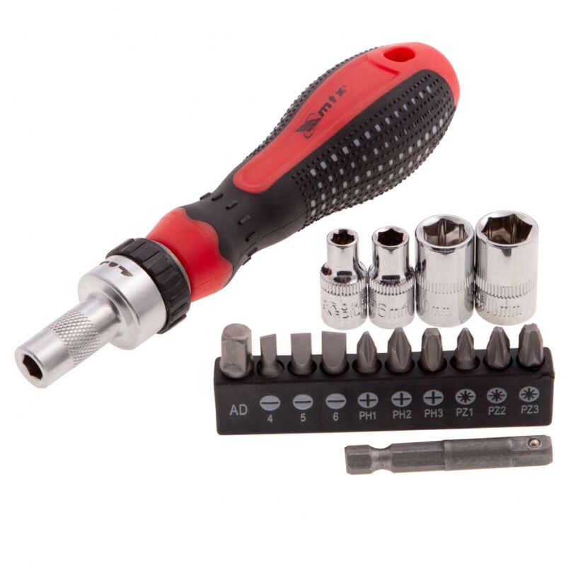 MTX - Cacciavite con set di punte e bussole 1/4" - 16 pezzi Cacciavite portapunte, 4 bussole, 3 a croce, 3 piatti, 3 a stella, 2 supporti 1/4" per bussole Uno per tutti! Il cacciavite portapunte MTX consente di sostituire tutti i vostri cacciaviti! Potrete quindi realizzare tutti i vostri lavori di montaggio/smontaggio con un unico strumento in quanto tutto è incluso. 13 in 1 È fornito con: 4 bussole 3 punte a croce 3 punte piatte 3 punte a stella 2 supporti 1/4" per bussole. È ovviamente compatibile con le altre bussole 1/4" Pratico e confortevole Il cacciavite è reversibile, dispone di una posizione "avvitamento" e di una posizione "svitamento". Il manico ergonomico in gomma garantisce una presa eccellente per un lavoro ottimale e confortevole. Inoltre, realizzato in acciaio al cromo vanadio, garantisce una perfetta resistenza all'usura e alla corrosione. Caratteristiche Generale Colori Rosso e nero Paese di origine Cina Tipo di Prodotto Set cacciavite e punte Materiali Acciaio al